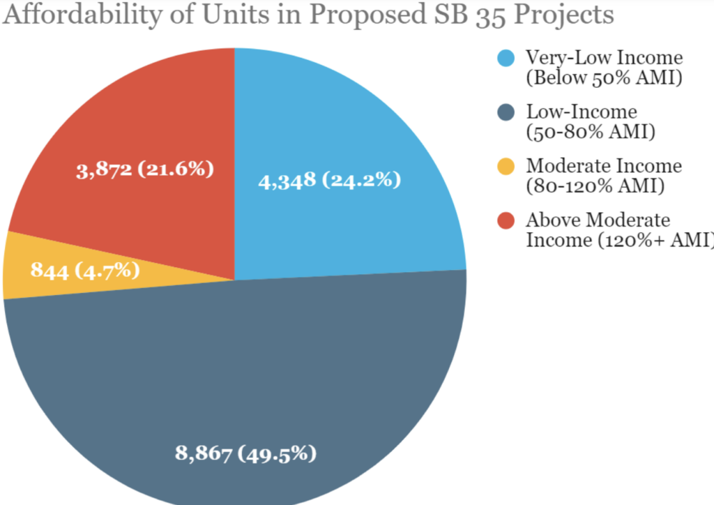 Second, the chart shows the number of homes that have been proposed under SB 35. Proposed doesn’t mean approved, much less built.
