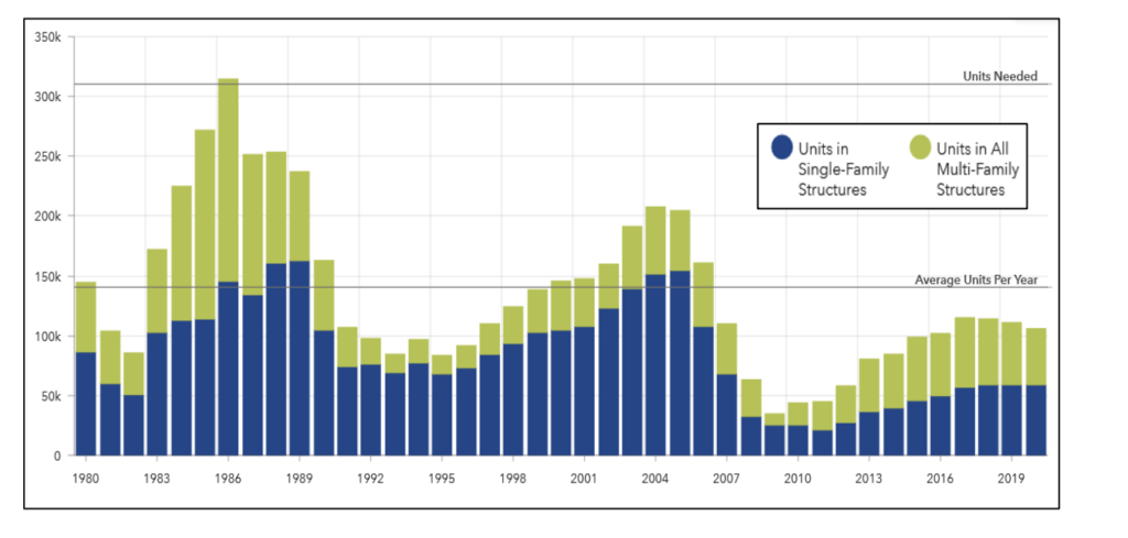 Much more needs to be done indeed. As the paper states, the Department of Housing and Community Development (HCD) currently estimates that “California must plan for the development of more than 2.5 million homes over the next eight years,” including a million homes for lower-income households. That works out to 312,500 units a year, of which 125,000 are affordable.