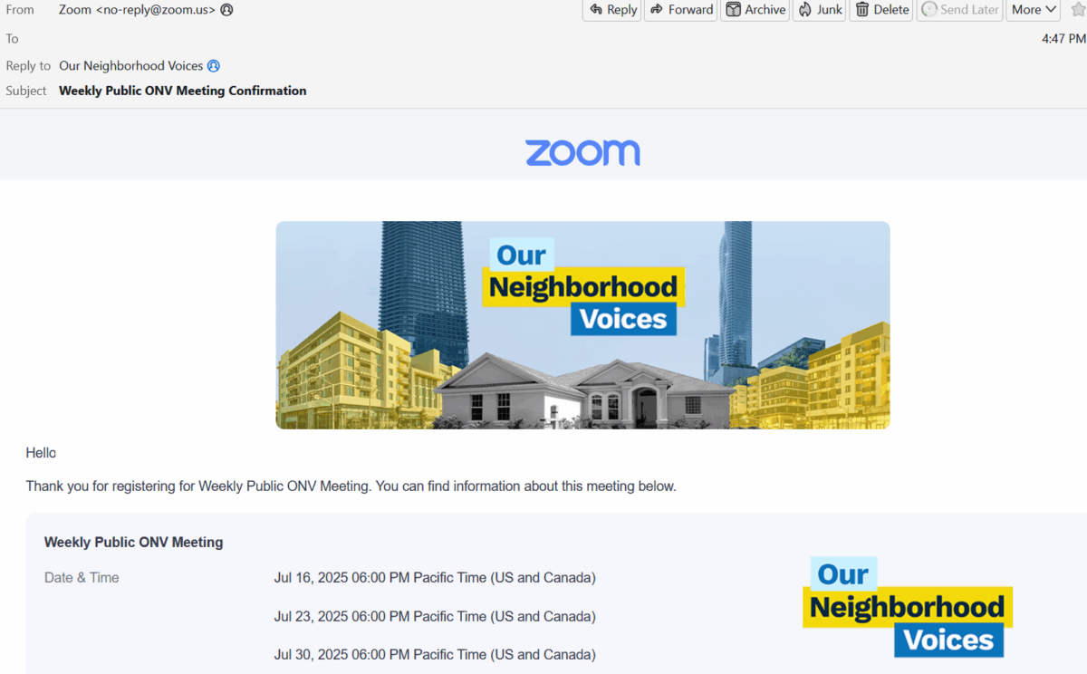 Please check your email account that you registered with, if the email is not in your “Inbox”, check your “Updates”, “Social”, “SPAM”, or “Junk” folder. This email will come from “Zoom”, from the email address “no-reply@zoom.us”.